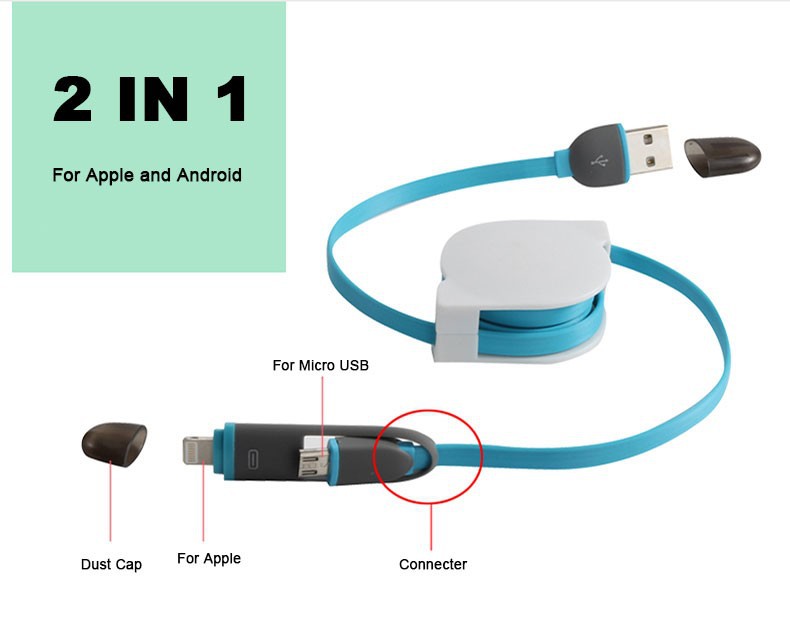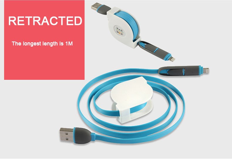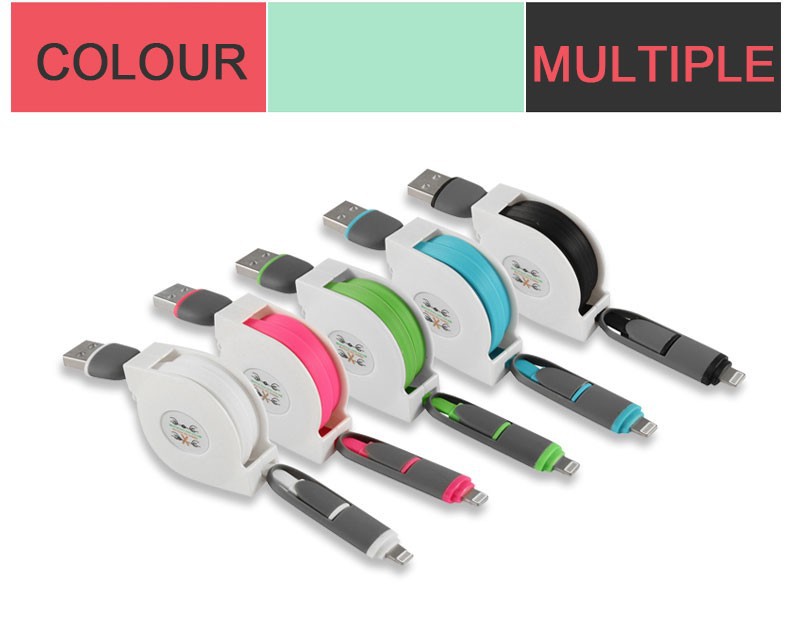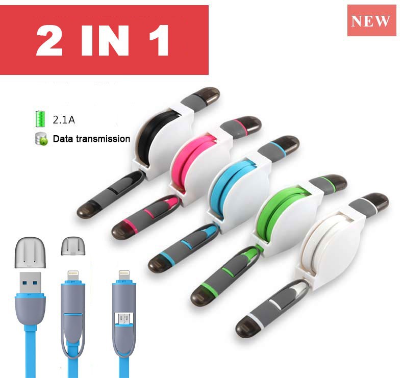 Retractable 2 in 1 Micro USB Sync TPE Charger Power 8 Pin Data Cable 1m For Ios 8 & Android for Iphone 5 6 Samsung 2in1 8PIN